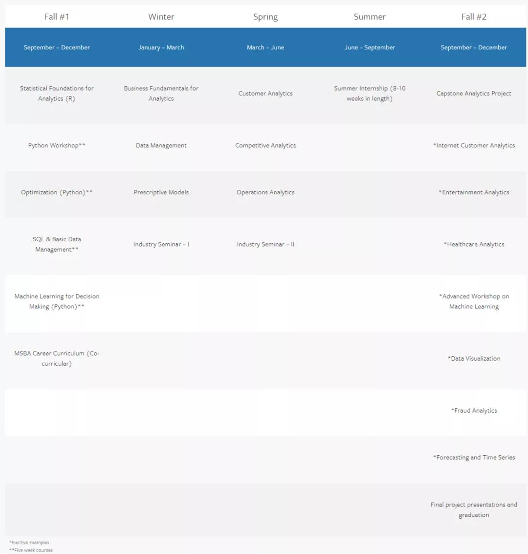 UCLA MSBA项目共需要修48学分,共分为5个学期,中间的夏季学期可以做一个为期8-10周的暑期实习。课程安排如下: