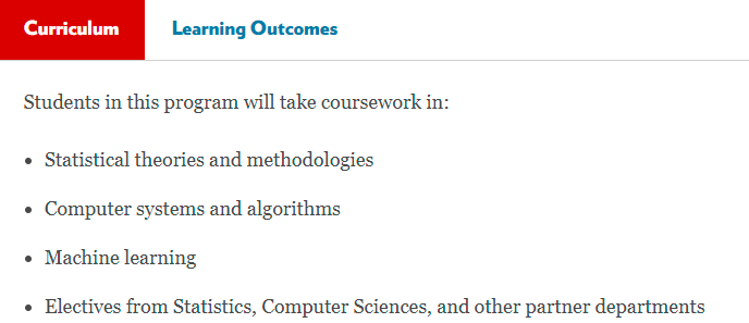 就读该项目的学生将参加以下课程:统计理论和方法计算机系统和算法机器学习统计学、计算机科学和其他合作部门的选修课