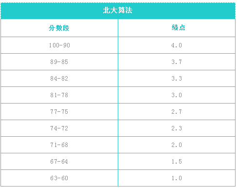就是北京大学采用的GPA计算的方法,这一算法算出来的结果会比较高,因为分数段分的更加细一些,标准如下: