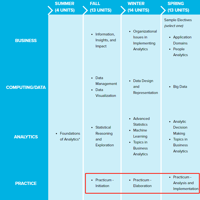 项目课程总共44个学分,分为Business, Computing/Data, Analytics和Practice四种类型。课程强调实践性,没有过于深究理论或数学的推导。