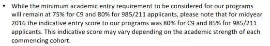 对于条例2中提到的满足C9大学平均分75%-79%,985/211大学80%-84%的学生,这些学生会在2017年第一学期申请递交截止日期—2016年10月31日之前,都会处于一个on hold的状态,即学校在2016年10月31日之后,才开始处理满足这些条件学生的申请,所以这批学生是出offer还是被reject,结果会出来的比较晚,希望让学生提前做好心理准备。