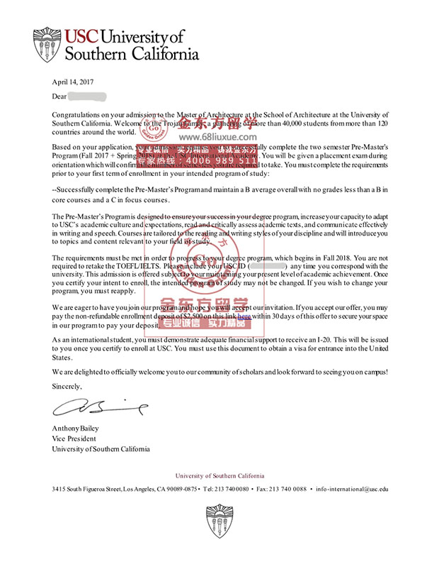 录取结果:University of Southern California南加州大学,预科