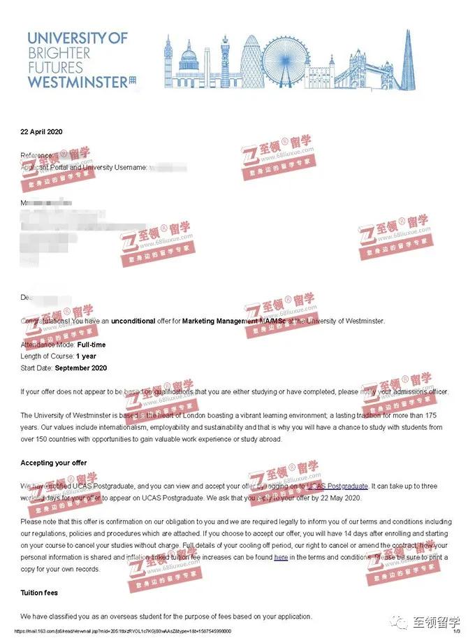 录取结果:University of Westminster,Master of market management威斯敏斯特大学市场营销管理硕士