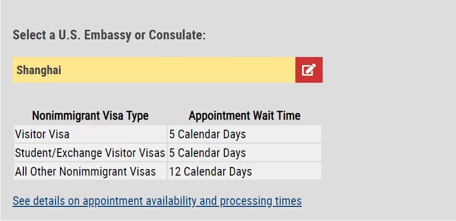 美国国务院领事事务局(U.S. Department of State)官网:https://travel.state.gov/content/travel/en/us-visas/visa-information-resources/wait-times.html